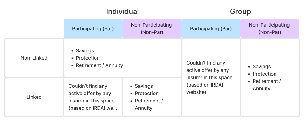 - Individual Savings: Includes endowment and variable insurance plans linked to benchmarks.