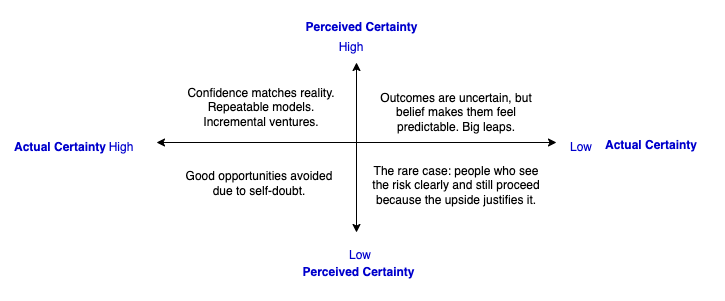 Most people who make big bets belong in the top-right: they’ve convinced themselves it will work. That confidence is necessary fuel. But it’s not the most interesting case.